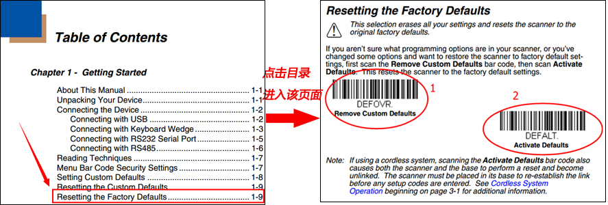 一般恢復出廠設置的介紹在第一章節,如上圖,我們在目錄中就可以很明顯的找到【Resetting the Factory Defaults】,點擊進入該頁面,依次掃描這兩個條碼即可。